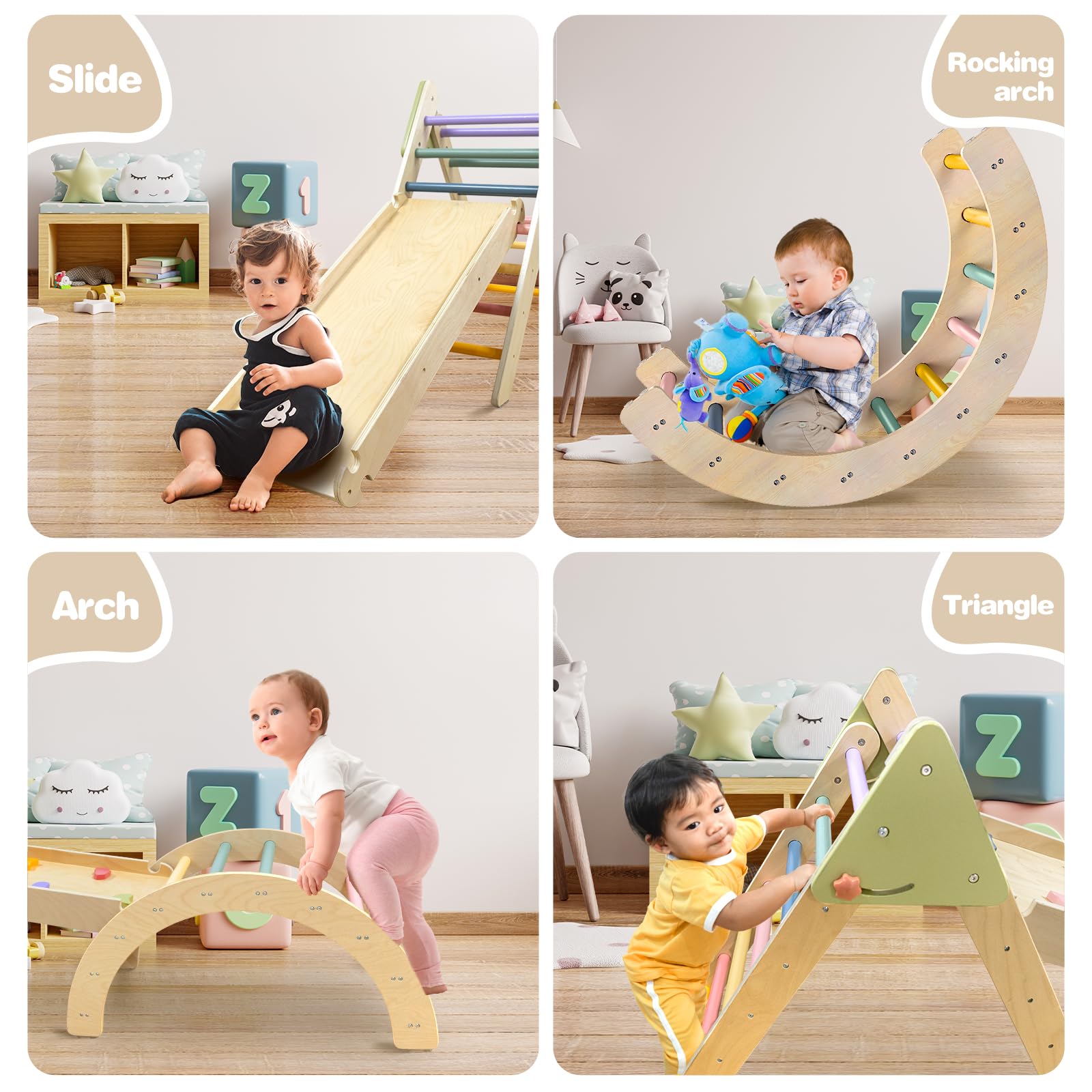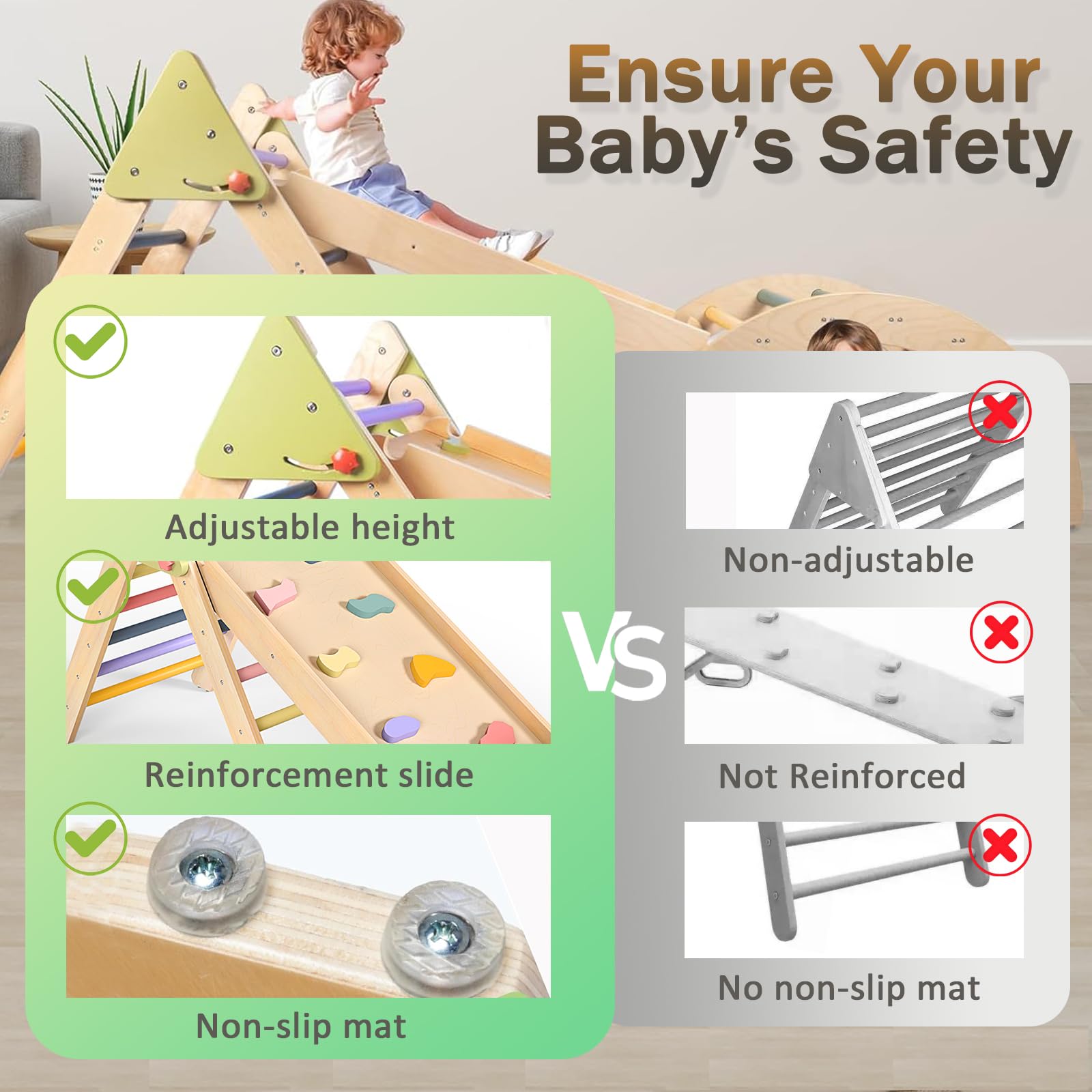 • Double-sided Climbing Toys: The front side is a baby climbing toys with 8 rainbow climbing hold, soft colors and smooth polishing, which won't hurt kids' hands when they grip it. Flip it over and it's a slide, so kids don't have to wait in line at the park anymore